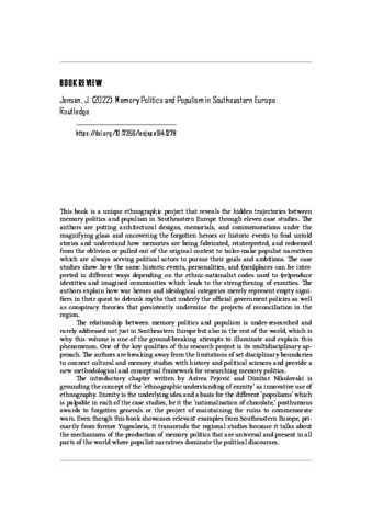 Stepanovic, Ivana (2023) Book Review. Jensen, J. (2022). Memory Politics and Populism in Southeastern Europe. Routledge. INTERSECTIONS: EAST EUROPEAN JOURNAL OF SOCIETY AND POLITICS, 9 (4). pp. 199-201. ISSN 2416-089X