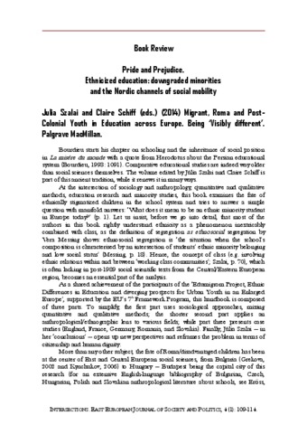 Erőss, Gábor (2018) Pride and Prejudice. Ethnicized education: downgraded minorities and the Nordic channels of social mobility : Book review of Julia Szalai and Claire Schiff (eds.) (2014) Migrant, Roma and PostColonial Youth in Education across Europe. Being ‘Visibly different’. Palgrave MacMillan. INTERSECTIONS: EAST EUROPEAN JOURNAL OF SOCIETY AND POLITICS, 4 (1). pp. 109-114. ISSN 2416-089X