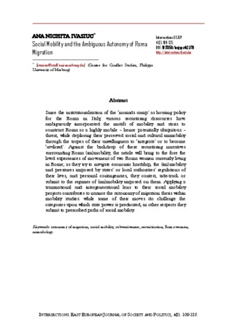 Ivasiuc, Ana Nichita (2018) Social Mobility and the Ambiguous Autonomy of Roma Migration. INTERSECTIONS: EAST EUROPEAN JOURNAL OF SOCIETY AND POLITICS, 4 (2). pp. 109-125. ISSN 2416-089X