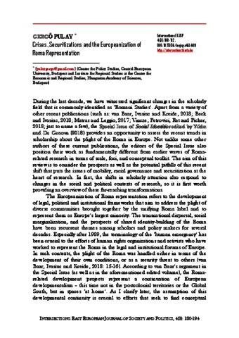Pulay, Gergely (2018) Crises, Securitizations and the Europeanization of Roma representation. INTERSECTIONS: EAST EUROPEAN JOURNAL OF SOCIETY AND POLITICS, 4 (3). pp. 180-192. ISSN 2416-089X