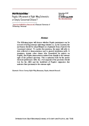 Kocyba, Piotr (2019) Pegida: A Movement of Right-Wing Extremists or Simply ‘Concerned Citizens’? INTERSECTIONS: EAST EUROPEAN JOURNAL OF SOCIETY AND POLITICS, 4 (4). pp. 72-88. ISSN 2416-089X