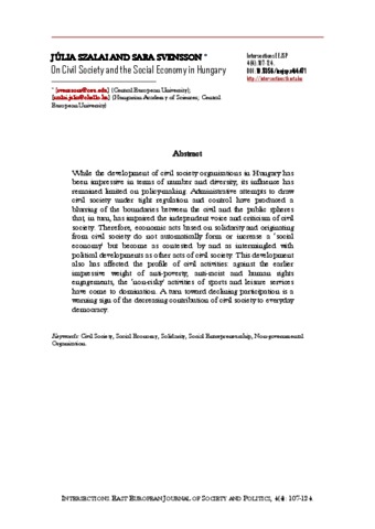 Szalai, Júlia and Svensson, Sara (2018) On Civil Society and the Social Economy in Hungary. INTERSECTIONS: EAST EUROPEAN JOURNAL OF SOCIETY AND POLITICS, 4 (4). pp. 107-124. ISSN 2416-089X