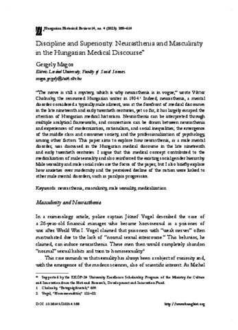 Magos, Gergely (2025) Discipline and Superiority: Neurasthenia and Masculinity in the Hungarian Medical Discourse. HUNGARIAN HISTORICAL REVIEW: NEW SERIES OF ACTA HISTORICA ACADEMIAE SCIENTIARIUM HUNGARICAE, 14 (4). pp. 588-614. ISSN 2063-8647