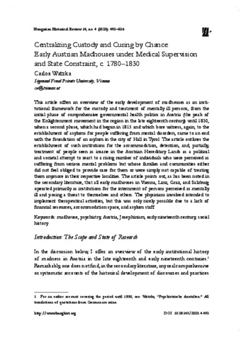Watzka, Carlos (2025) Centralizing Custody and Curing by Chance: Early Austrian Madhouses under Medical Supervision and State Constraint, c. 1780–1830. HUNGARIAN HISTORICAL REVIEW: NEW SERIES OF ACTA HISTORICA ACADEMIAE SCIENTIARIUM HUNGARICAE, 14 (4). pp. 493-536. ISSN 2063-8647