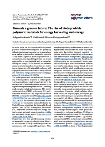 Prashantha, Kalappa and Kariyappa Gowda, Guddenahalli Shivanna (2025) Towards a greener future: The rise of biodegradable polymeric materials for energy harvesting and storage. EXPRESS POLYMER LETTERS, 19 (11). pp. 1090-1091. ISSN 1788-618X