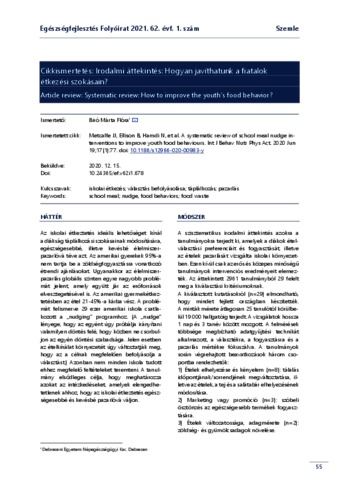 Biró, Márta Flóra (2021) Cikkismertetés: Irodalmi áttekintés: Hogyan javíthatunk a fiatalok étkezési szokásain? EGÉSZSÉGFEJLESZTÉS, 62 (1). pp. 55-56. ISSN 1786-2434 (nyomtatott); 2498-6666 (elektronikus)