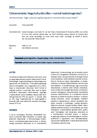 Vitrai, József (2020) Cikkismertetés: Nagy kulturális tőke = normál testtömegindex? = Article review: High cultural capital equal to normal body mass index? EGÉSZSÉGFEJLESZTÉS, 61 (4). pp. 73-75. ISSN 1786-2434 (nyomtatott); 2498-6666 (elektronikus)