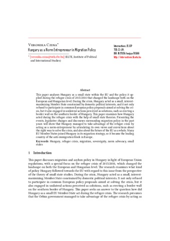 This paper analyses Hungary as a small state within the EU and the policy it applied during the refugee crisis of 2015/2016 that changed the landscape both on the European and Hungarian level. During the crisis, Hungary acted as a small, interest-maximizing Member State constrained by domestic political interests, and it not only refused to participate in common European policy proposals aimed at solving the crisis, but it also engaged in unilateral actions perceived as solutions, such as erecting a border wall on the southern border of Hungary. This paper examines how Hungary acted during the refugee crisis with the help of small state theories. Presenting the events, legislative changes and discourses surrounding migration policy in the past years will show that Hungary managed to take advantage of the refugee crisis by acting as a norm-entrepreneur by articulating its own views and convictions about the right way to solve the crisis, and also about the future of the EU as a whole. Many EU Member States joined Hungary in its migration strategy, so it became the leading country of the anti-immigration block in Europe.