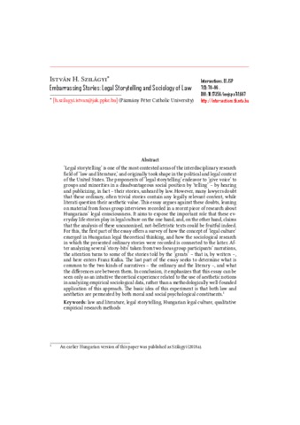 ‘Legal storytelling’ is one of the most contested area of the interdisciplinary research field of ‘law and literature’, which has taken shape in the political and legal context of the United States originally. The proponents of ‘legal storytelling’ endeavour to ‘give voice’ to groups and minorities of disadvantageous social position by ‘telling’ – by hearing and publicizing, in fact – their stories unheard by law. However, many lawyers doubt that these everyday life, often trivial, stories carry any legally relevant content, while literati question their aesthetical value. The essay argues against these doubts leaning on the material of focus group interviews recorded in a recent research on the Hungarians’ legal consciousness. It aims to expose the important role that these everyday life stories play in legal culture on the one hand, and, on the other hand, that the analysis of these uncanonised, not-belletristic texts could be fruitful indeed. For this, the first part of the essay offers a survey on how the concept of ‘legal culture’ emerged in Hungarian legal theoretical thinking, and how the sociological researches, in which the presented ordinary stories were recorded, connected to that. After analysing several story-bits taken from two focus group participants’ narrations, the attention turns to stories told by the ‘greats’, that is by writers, and here enters Franz Kafka in the scope. The last part of the essay seeks to determine what relates the two kinds – the ordinary and the literary – of narratives and what are the differences between them. For a conclusion, it emphasizes that this essay can be seen only as an intuitive theoretical experience for using aesthetic notions in analysing empirical sociological data rather than a methodologically well-founded application of that. The basic idea of this experiment is that both law and aesthetics are permeated by moral, and social psychological constituents.
