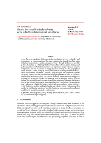 Aims. There are significant differences in harm reduction services availability and performance in various countries. The paper examines the state of one of the harm reduction interventions – needle exchange services – through the lenses of morality policy, attempting to establish potential relationships between policy framing and policy outcomes. Method. The research uses an explorative design with cross-country comparison. The unit of analysis is drug policy in a country, and the geographical scope includes Czechia, Hungary, Poland, and Slovakia, following the maximum variation case selection procedure. Countries’ drug strategies are analysed to identify the policy frames, and data on needle exchange programmes are used to assess the state of harm reduction. Results. The analysis identified health and social drug policy framing in Czechia and Slovakia, the morality frame in Hungary, and no frame in Poland. The availability and coverage of needle exchange programmes is the highest in Czechia, followed by Slovakia, Hungary and Poland. Conclusions. The Hungarian case confirms the relationship between morality framing and poor policy outcomes, while the Czech case between health framing and effective policy. Further research is needed to establish the function of morality framing as a necessary and/or sufficient condition for unsatisfactory policy performance.