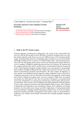 Brković, Čarna and De Lauri, Antonio and Hess, Sabine (2021) Grassroots responses to mass migration in Europe : Introduction. INTERSECTIONS: EAST EUROPEAN JOURNAL OF SOCIETY AND POLITICS, 7 (2). pp. 1-12. ISSN 2416-089X