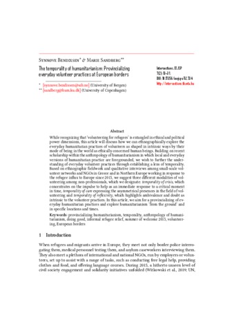 While recognizing that ‘volunteering for refugees’ is entangled in ethical and political power dimensions, this article will discuss how we can ethnographically explore the everyday humanitarian practices of volunteers as shaped in intrinsic ways by their mode of being in the world as ethically concerned human beings. Building on recent scholarship within the anthropology of humanitarianism in which local and everyday versions of humanitarian practice are foregrounded, we wish to further the understanding of everyday volunteer practices through establishing a lens of temporality. Based on ethnographic fieldwork and qualitative interviews among small-scale volunteer networks and NGOs in Greece and in Northern Europe working in response to the refugee influx to Europe since 2015, we suggest three different modalities of volunteering among non-professionals, which we designate: temporality of crisis, which concentrates on the impulse to help as an immediate response to a critical moment in time, temporality of care expressing the asymmetrical presences in the field of volunteering and temporality of reflexivity, which highlights ambivalence and doubt as intrinsic to the volunteer practices. In this article, we aim for a provincializing of everyday humanitarian practices and explore humanitarianism ‘from the ground’ and in specific locations and times.