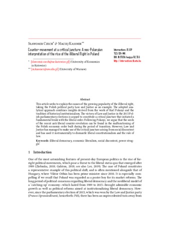 Czech, Slawomir and Kassner, Maciej (2021) Counter-movement at a critical juncture: A neo-Polanyian interpretation of the rise of the illiberal Right in Poland. INTERSECTIONS: EAST EUROPEAN JOURNAL OF SOCIETY AND POLITICS, 7 (2). pp. 128-148. ISSN 2416-089X