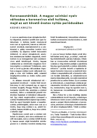 Kedves, Kriszta (2025) Koronaesztétikák : A magyar színházi nyelv változása a koronavírus első hulláma, majd az azt követő óvatos nyitás periódusában. THEATRON: SZÍNHÁZTUDOMÁNYI PERIODIKA, 19 (3). pp. 38-49. ISSN 1418-9941