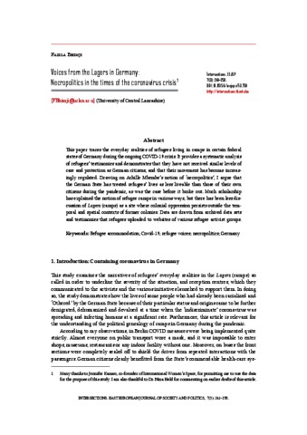 This paper traces the everyday realities of refugees living in camps in certain federal states of Germany during the ongoing COVID-19 crisis. It provides a systematic analysis of refugees’ testimonies and demonstrates that they have not received similar levels of care and protection as German citizens, and that their movement has become increasingly regulated. Drawing on Achille Mbembe’s notion of ‘necropolitics’, I argue that the German State has treated refugees’ lives as less liveable than those of their own citizens during the pandemic, as was the case before it broke out. Much scholarship has explained the notion of refugee camps in various ways, but there has been less discussion of Lagers (camps) as a site where colonial oppression persists outside the temporal and spatial contexts of former colonies. Data are drawn from archived data sets and testimonies that refugees uploaded to websites of various refugee activist groups.