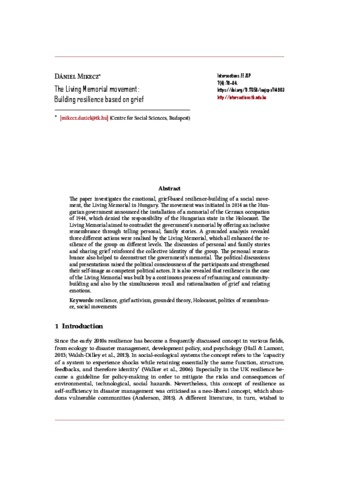 The paper investigates the emotional, grief-based resilience-building of a social movement, the Living Memorial in Hungary. The movement was initiated in 2014 as the Hungarian government announced the installation of a memorial of the German occupation of 1944, which denied the responsibility of the Hungarian state in the Holocaust. The Living Memorial aimed to contradict the government’s memorial by offering an inclusive remembrance through telling personal, family stories. A grounded analysis revealed three different actions were realised by the Living Memorial, which all enhanced the resilience of the group on different levels. The discussion of personal and family stories and sharing grief reinforced the collective identity of the group. The personal remembrance also helped to deconstruct the government’s memorial. The political discussions and presentations raised the political consciousness of the participants and strengthened their self-image as competent political actors. It is also revealed that resilience in the case of the Living Memorial was built by a continuous process of reframing and community-building and also by the simultaneous recall and rationalisation of grief and relating emotions.
