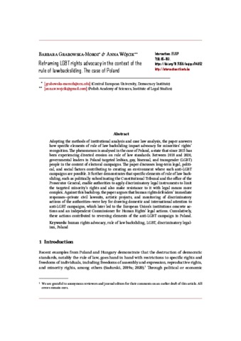Grabowska-Moroz, Barbara and Wojcik, Anna (2021) Reframing LGBT rights advocacy in the context of the rule of law backsliding : The case of Poland. INTERSECTIONS: EAST EUROPEAN JOURNAL OF SOCIETY AND POLITICS, 7 (4). pp. 85-103. ISSN 2416-089X