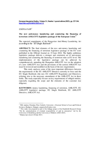 Papp, Zsófia (2025) The new anti-money laundering and countering the financing of terrorism (AML/CFT) legislative package of the European Union : The expected amendments of the Hungarian Anti-Money Laundering Act according to the “EU Single Rulebook”. EUROPEAN INTEGRATION STUDIES, 21 (1 (SE)). pp. 227-246. ISSN 1588-6735
