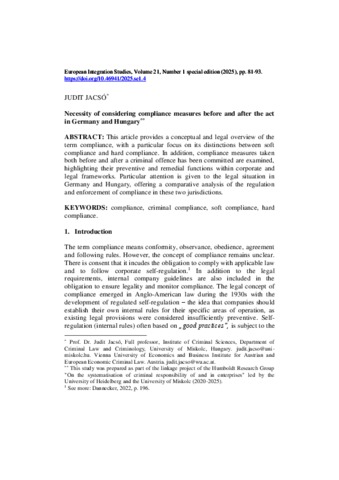 Jacsó, Judit (2025) Necessity of considering compliance measures before and after the act in Germany and Hungary. EUROPEAN INTEGRATION STUDIES, 21 (1 spec). pp. 81-93. ISSN 1588-6735