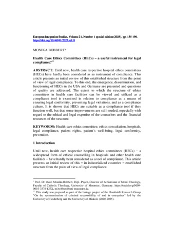 Monika, Bobbert (2025) Health Care Ethics Committees (HECs) – a useful instrument for legal compliance? EUROPEAN INTEGRATION STUDIES, 21 (1 spec). pp. 155-190. ISSN 1588-6735
