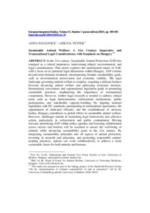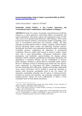 Paulovics, Anita and Vetter, Szilvia (2025) Sustainable Animal Welfare: A 21st Century Imperative and Transnational Legal Considerations, with Emphasis on Hungary. EUROPEAN INTEGRATION STUDIES, 21 (1 spec). pp. 389-405. ISSN 1588-6735