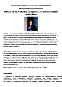 A tanulmány Ausztria kulturális szabályozásának, kulturális intézmény- és tevékenységrendszerének a leíró bemutatását célozza. Magyar nyelven az aktuális helyzetre vonatkozóan hasonló áttekintést nem találtunk, ezt a hiányt igyekeztünk pótolni. Az ország kulturális helyzetének leíró bemutatásán túl az összegzésben a magyar helyzettel vonható párhuzamokra és különbségekre is igyekszünk rámutatni. A komparatív vizsgálat keretét a The Compendium of Cultural Policies and Trends in Europe online monitoring- és adatbázis rendszer szolgáltatta, amely egységes struktúrát és tematikus egységeket biztosít az egyes nemzetek kulturális politikáinak rendszerszintű vizsgálatához. Továbbá a munkánk elméleti tanulmányokra, jogszabályokra, oktatáspolitikai dokumentumokra és statisztikai adatokra támaszkodik. | The study aims to provide a descriptive presentation of Austria's cultural regulation, cultural institutions and activity system. We have not found a similar overview of the current situation in Hungarian, and we have tried to fill this gap. In addition to the descriptive presentation of the country's cultural situation, we also try to point out the parallels and differences with the Hungarian situation in the summary. The framework of the comparative study is provided by the online monitoring and database system The Compendium of Cultural Policies and Trends in Europe, which provides a uniform structure and thematic units for the systematic examination of the cultural policies of individual nations. Furthermore, our work relies on theoretical studies, legislation, educational policy documents and statistical data.