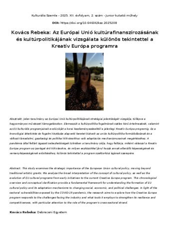 Jelen tanulmány az Európai Unió kultúrpolitikájának stratégiai jelentőségét vizsgálja, túllépve a hagyományos művészeti támogatásokon. Elemezzük a kultúrpolitika fogalmának széles körű értelmezését, valamint az EU kulturális programjainak evolúcióját a korai kezdeményezésektől a jelenlegi Kreatív Európa programig. Ez a kronológiai áttekintés és fogalmi tisztázás alapvető keretet biztosít az uniós kultúrpolitika formálódásának és a változó társadalmi, gazdasági és politikai kihívásokhoz való adaptációs mechanizmusainak megértéséhez. A pandémia által feltárt ágazati sebezhetőségek tükrében a tanulmány célja, hogy feltárja, miként válaszol a Kreatív Európa program az iparágat érő kihívásokra, és milyen eszközökkel járul hozzá annak ellenálló képességének és versenyképességének erősítéséhez, különös tekintettel a program szektorközi ágának szerepére. | This study examines the strategic importance of the European Union cultural policy, moving beyond traditional artistic grants. We analyze the broad interpretation of the concept of cultural policy, as well as the evolution of EU cultural programs from early initiatives to the current Creative Europe program. This chronological overview and conceptual clarification provide a fundamental framework for understanding the formation of EU cultural policy and its adaptation mechanisms to changing social, economic, and political challenges. In light of the sectoral vulnerabilities exposed by the COVID-19 pandemic, the research aims to explore how the Creative Europe program responds to the challenges facing the industry and what tools it employs to strengthen its resilience and competitiveness, with particular attention to the role of the program's cross-sectoral strand.