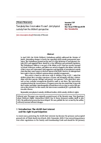 In April 2022, the Polish Children’s Ombudsman publicly addressed the Minister of Justice, demanding changes in family law regarding child custody post-parental separation. The Ombudsman pointed out the lack of a legal definition of joint physical custody (JPC) and suggested there should be a clear definition and associated regulation. The Ombudsman’s address is one part of the debate on JPC that has recently emerged in Poland. Politicians, mothers, and fathers are actively engaged in the debate, with each of their voices well represented. Both supporters and opponents of joint physical custody claim that their main concern is the best interest of the child. However, no attempts have been made to listen to children’s opinions about custodial arrangements. This article is based on interviews with 23 children living in JPC. I asked the children about their everyday experience of home and belonging and their relationships with their parents, siblings, and parents’ new partners. I also asked their opinions on how custodial arrangements should be made to suit them. The interviewees complained about the inconvenience of frequent moves but also stated that living with their mother and father interchangeably allowed them to be as close to each of the parents as they desired. For this reason, the interviewees considered JPC a preferable solution after divorce.