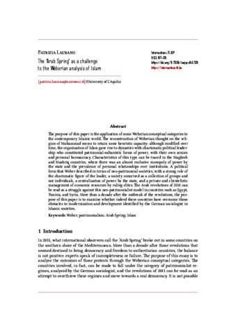 Laurano, Patrizia (2023) The 'Arab Spring’ as a challenge to the Weberian analysis of Islam. INTERSECTIONS: EAST EUROPEAN JOURNAL OF SOCIETY AND POLITICS, 9 (3). pp. 107-129. ISSN 2416-089X