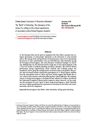 Caetano, Pedro Jorge and Mendes, Manuela (2023) The ‘Spirit’ of Schooling: The relevance of the sense of a calling on the school experiences of secondary-school Roma/Ciganos students. INTERSECTIONS: EAST EUROPEAN JOURNAL OF SOCIETY AND POLITICS, 9 (3). pp. 148-166. ISSN 2416-089X
