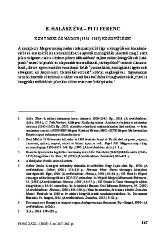 B. Halász, Éva and Piti, Ferenc (2025) Kont Miklós nádor (1356-1367) közgyűlései. FONS: FORRÁSKUTATÁS ÉS TÖRTÉNETI SEGÉDTUDOMÁNYOK, 32 (3). pp. 247-262. ISSN 1217-8020