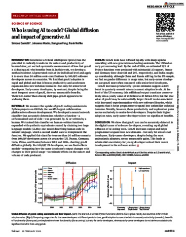 Daniotti, Simone and Wachs, Johannes and Feng, Xiangnan and Neffke, Frank (2026) Who is using AI to code? : Global diffusion and impact of generative AI. SCIENCE, 391 (6787). pp. 831-835. ISSN 0036-8075