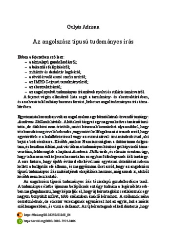 Gulyás, Adrienn (2023) Az angolszász típusú tudományos írás. In: Tudománystratégia. Ludovika Egyetemi Kiadó, Budapest, pp. 55-69. ISBN 9786156598639; 9789636530037; 9786156598646
