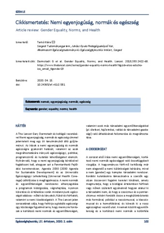 Tarkó, Klára (2020) Cikkismertetés: Nemi egyenjogúság, normák és egészség. EGÉSZSÉGFEJLESZTÉS, 61 (2). pp. 102-104. ISSN 1786-2434 (nyomtatott); 2498-6666 (elektronikus)