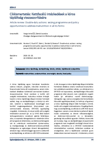 Varga, Anita and Zámbó, Leonóra (2020) Cikkismertetés: Kettőscélú intézkedések a kóros tápláltság visszaszorítására. EGÉSZSÉGFEJLESZTÉS, 61 (2). pp. 94-95. ISSN 1786-2434 (nyomtatott); 2498-6666 (elektronikus)
