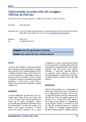 Vitrai, József (2020) Cikkismertetés: Az emberi tőke 195 országban 1990-ben és 2016-ban. EGÉSZSÉGFEJLESZTÉS, 61 (2). pp. 98-99. ISSN 1786-2434 (nyomtatott); 2498-6666 (elektronikus)