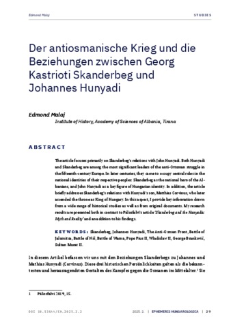 Malaj, Edmond (2025) Der antiosmanische Krieg und die Beziehungen zwischen Georg Kastrioti Skanderbeg und Johannes Hunyadi = Georg Kastrioti (Szkanderbég) és Hunyadi János törökellenes harca és kapcsolatai. EPHEMERIS HUNGAROLOGICA, 5 (2). pp. 29-52. ISSN 2786-3522