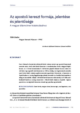 Tóth, Endre (2025) Az apostoli kereszt formája, jelentése és jelentősége : A magyar államcímer kialakulásához = The Form, Meaning and Significance of the Apostolic Cross (In relation to the development of the Hungarian coat of arms). EPHEMERIS HUNGAROLOGICA, 5 (1). pp. 75-112. ISSN 2786-3522