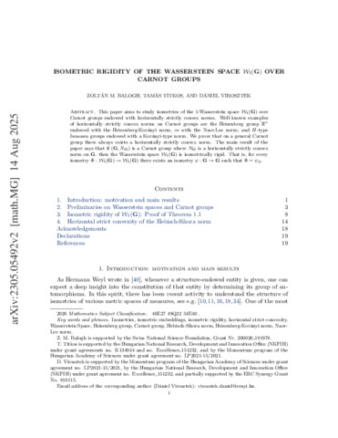 Balogh, Zoltán M. and Titkos, Tamás and Virosztek, Dániel (2026) Isometric Rigidity of the Wasserstein Space W1(G) Over Carnot Groups. POTENTIAL ANALYSIS, 64 (1). ISSN 0926-2601