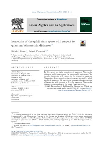 Simon, Richárd and Virosztek, Dániel (2025) Isometries of the qubit state space with respect to quantum Wasserstein distances. LINEAR ALGEBRA AND ITS APPLICATIONS, 714. pp. 1-14. ISSN 0024-3795