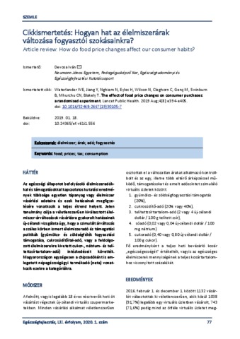 Devosa, Iván (2020) Cikkismertetés: Hogyan hat az élelmiszerárak változása fogyasztói szokásainkra? = Article review: How do food price changes affect our consumer habits? EGÉSZSÉGFEJLESZTÉS, 61 (1). pp. 77-79. ISSN 1786-2434 (nyomtatott); 2498-6666 (elektronikus)