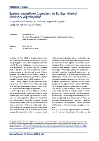 Devosa, Iván (2020) Szakmai vezetőknek 1 percben: Az Európai Alkohol Akcióterv végrehajtása = For professional leaders in 1 minute: Implementing the European Action Plan on Alcohol. EGÉSZSÉGFEJLESZTÉS, 61 (1). pp. 4-5. ISSN 1786-2434 (nyomtatott); 2498-6666 (elektronikus)