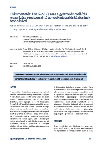 Prievara, Dóra Katalin (2020) Cikkismertetés: Live 5-2-1-0, azaz a gyermekkori elhízás megelőzése rendszerszintű gondolkodással és közösségek bevonásával = Article review: Live 5-2-1-0, that is the prevention of the childhood obesity through systems thinking and community involvement. EGÉSZSÉGFEJLESZTÉS, 61 (1). pp. 57-58. ISSN 1786-2434 (nyomtatott); 2498-6666 (elektronikus)