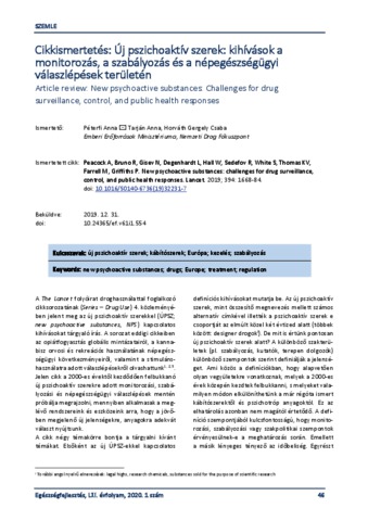 Péterfi, Anna and Tarján, Anna and Horváth, Gergely Csaba (2020) Cikkismertetés: Új pszichoaktív szerek: kihívások a monitorozás, a szabályozás és a népegészségügyi válaszlépések területén = Article review: New psychoactive substances: Challenges for drug surveillance, control, and public health responses. EGÉSZSÉGFEJLESZTÉS, 61 (1). pp. 46-50. ISSN 1786-2434 (nyomtatott); 2498-6666 (elektronikus)
