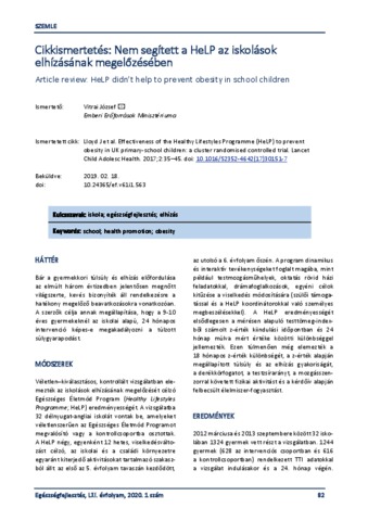 Vitrai, József (2020) Cikkismertetés: Nem segített a HeLP az iskolások elhízásának megelőzésében = Article review: HeLP didn’t help to prevent obesity in school children. EGÉSZSÉGFEJLESZTÉS, 61 (1). pp. 82-83. ISSN 1786-2434 (nyomtatott); 2498-6666 (elektronikus)