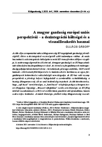 A cikk célja szempontokat adni a Magyarország EU-tagságának gazdasági jelentőségéről, illetve a dezintegráció veszteségeiről szóló tudományos vitához. Az uniós hasznokat és a dezintegrációs költségeket a nettó EU-transzfereken túllépve vizsgálja, és azokra nagyságrendi becsléseket ad. A magyar gazdaság és az EU kapcsolatának változására hat forgatókönyvet vázol. Az elemzést a forgatókönyvek makrogazdasági pályája három kiemelt eleme – beruházások, pénzügyi stabilitás, GDP-emelő hatások – eltéréseinek feltérképezésére és hatásbecslésére korlátozza, az egyes forgatókönyvek bekövetkezési valószínűségét nem tárgyalja. Az EU-hoz való viszony perspektívái a jelenlegi helyzet befagyásától a szembenállás eszkalálódásáig, a huxitig (Hungarian exit), sőt az unió bedöntéséig terjednek. A cikk következtetése, hogy „soft huxit” nem lehetséges, a „hard huxit” velejárója pedig a schengeni övezet elhagyása. Ugyanígy „Brüsszel elfoglalása” esetén sem lehetséges az EU félig történő visszabontása és a 30 évvel ezelőtti közös piacként való újraindítása, hanem csak a teljes bedöntése. A másik lehetséges jövőbeli irány Magyarország visszailleszkedése az EU-ba, majd továbblépés az euró bevezetése felé. Az egyik végletben Magyarország újra perifériára szorul, és a gazdasági teljesítmény a koronavírusjárvány alatti leállás hatásának többszörösével zuhan. A másik véglet szerint megerősödnek azok a kötelékek, amelyek a fejlett világ egyik – sok belső nehézséggel küzdő és kiutakat kereső – centrumához kapcsolják Magyarországot.