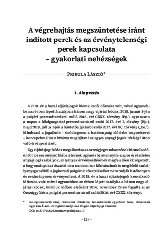 Pribula, László (2025) A végrehajtás megszüntetése iránt indított perek és az érvénytelenségi perek kapcsolata – gyakorlati nehézségek. In: A végrehajtási jog aktuális kérdései. Modern Összehasonlító Jogi Trendek . Mádl Ferenc Összehasonlító Jogi Intézet, Budapest, pp. 124-143. ISBN 9786156356604; 9786156356611; 9786156356628