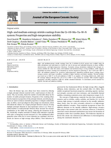 Souček, Pavel and Debnárová, Stanislava and Zuzjaková, Šárka and Lin, Shuyao and Fekete, Matej and Czigány, Zsolt and Balázsi, Katalin and Vrána, Lukáš and Pitoňáková, Tatiana and Jašek, Ondřej and Zeman, Petr and Koutná, Nikola (2026) High- and medium-entropy nitride coatings from the Cr–Hf–Mo–Ta–W–N system: Properties and high-temperature stability. JOURNAL OF THE EUROPEAN CERAMIC SOCIETY, 46 (10). No. 118262. ISSN 0955-2219