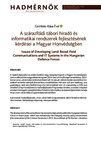 Gombás-Kása, Éva (2025) A szárazföldi tábori híradó és informatikai rendszerek fejlesztésének kérdései a Magyar Honvédségben = Issues of Developing Land-Based Field Communications and IT Systems in the Hungarian Defence Forces. HADMÉRNÖK, 20 (2). pp. 37-53. ISSN 1788-1919