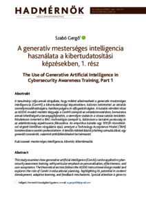 A tanulmány célja annak vizsgálata, hogy miként alkalmazható a generatív mesterséges intelligencia (GenMI) a kibertudatossági képzésekben, különös tekintettel az oktatás személyreszabhatóságára, hatékonyságára és elfogadottságára. A kutatás elméleti része az ADDIE-modell mentén tárgyalja a GenMI szerepét az oktatástervezésben, bemutatva annak lehetőségeit a tananyagfejlesztés, a személyre szabás és a visszacsatolás területén. Részletesen ismerteti a RAG-technológia szerepét is, különösen a tartalmi pontosság és az adatbiztonság aspektusaira fókuszálva. Az empirikus kutatás egy 109 fő részvételével végzett kérdőíves vizsgálatra épül, amelyet a Technology Acceptance Model (TAM) keretrendszere szerint szerkesztettem. A kérdőív többek között phishing szimulációkat, egy generált szcenáriót, valamint attitűdkérdéseket tartalmazott. | This study examines how generative artificial intelligence (GenAI) can be applied in cybersecurity awareness training, with particular emphasis on personalisation, effectiveness, and user acceptance. The theoretical section follows the ADDIE instructional design model and explores the role of GenAI in educational planning, highlighting its potential in content development, adaptive learning, and feedback mechanisms. Special attention is given to Retrieval-Augmented Generation (RAG) technologies, focusing on content accuracy and data protection considerations. The empirical part of the research is based on a questionnaire survey conducted with 109 participants and designed according to the Technology Acceptance Model (TAM). The questionnaire included phishing simulations, an AI-generated cybersecurity scenario, and attitude-based questions. The aim of the study is to assess how non-expert users perceive and evaluate cybersecurity training materials generated by artificial intelligence, and to identify key factors influencing their acceptance and perceived usefulness.